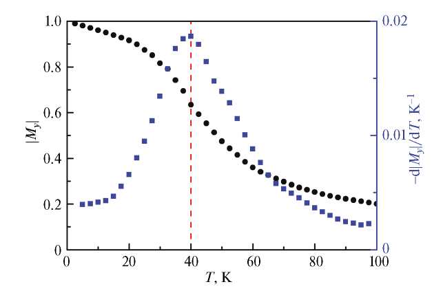 Рис. 2. Зависимость среднего модуля проекции намагниченности на ось легкого намагничивания |My| и производной −d |My| dT от температуры T.