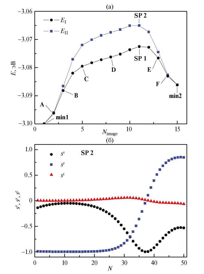 На рис. 3 показаны 9 из 15 последовательных изображений системы при перемагничивании за счет формирования антидоменной стенки. На первом изображении (min 1) система находится в основном состоянии. Затем на правом конце цепочки начинает формироваться антидоменная стенка (изображения A и B). Затем антидоменная стенка движется справа налево (изображения C и D), достигая седловой точки (SP 1) ближе к левому концу цепочки. Наконец, антидоменная стенка уничтожается на левом конце цепочки (изображения E и F). В результате атомная цепочка переходит в метастабильное состояние (min 2), в котором магнитные моменты направлены “вниз”. Энергии этих конфигураций показаны на рис. 4a.