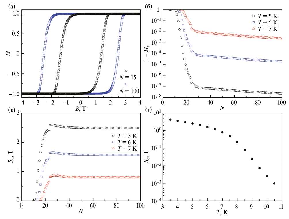 Видно, что величины Mr и Bc выходят на константу при больших N, при этом 1 −Mr ~N−1. Зависимость коэрцитивной Bc силы цепочки из 100 атомов Co от температуры представлена на рис. 6г. Видно, что величина Bc экспоненциально падает с увеличением температуры, что согласуется с формулой (14).