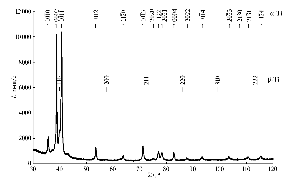 На рис. 1 приведена типичная дифрактограмма, полученная с помощью θ/2θ-рентгеноструктурного фазового анализа (РСФА), которая в меньших углах дифракции 2θ содержит наиболее интенсивные брэгговские отражения 0002, 101¯1 и 101¯0 α-фазы, демонстрируя выраженную текстуру кристаллографических ориентаций α-зерен в сечении (RD), поперечном плоскости прокатки. α-фаза является ключевой фазовой составляющей в плите изучаемого сплава. Малый по интенсивности и практически единственный рефлекс исходной β-фазы 110 в виде “наплыва” на соседний рефлекс 101¯1 α-фазы позволяет сделать вывод, что количество остаточной β-фазы выявляется на пределе разрешения метода и не превышает 3–5 мас.% (рис. 1).