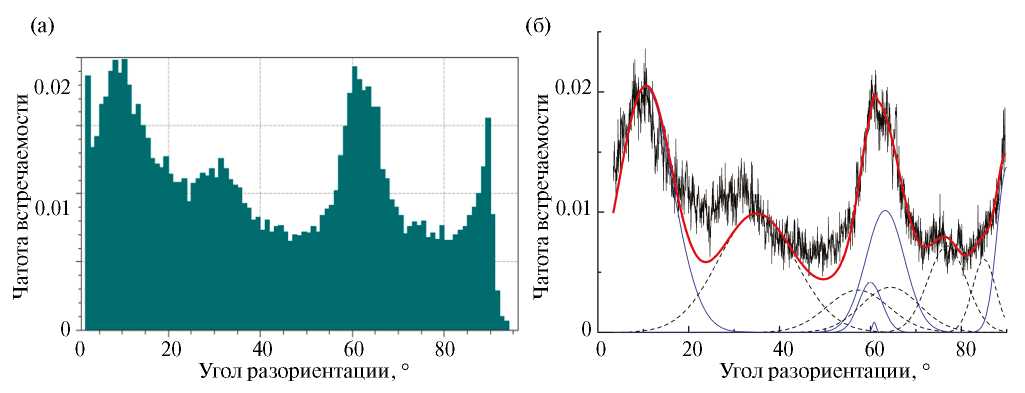 Рис. 3. Экспериментальная (а) и расчетные (б) гистограммы распределения угла разориентации α-кристаллитов в поперечном сечении (RD) плиты сплава Ti–6Al–4V. Сплошная линия черного цвета соответствует экспериментальной гистограмме, жирная сплошная линия красного цвета — суммарной функции Гаусса, состоящей из функций Гаусса для о.с. Бюргерса (сплошные тонкие линии) и для двойниковых ориентаций (пунктирные линии).