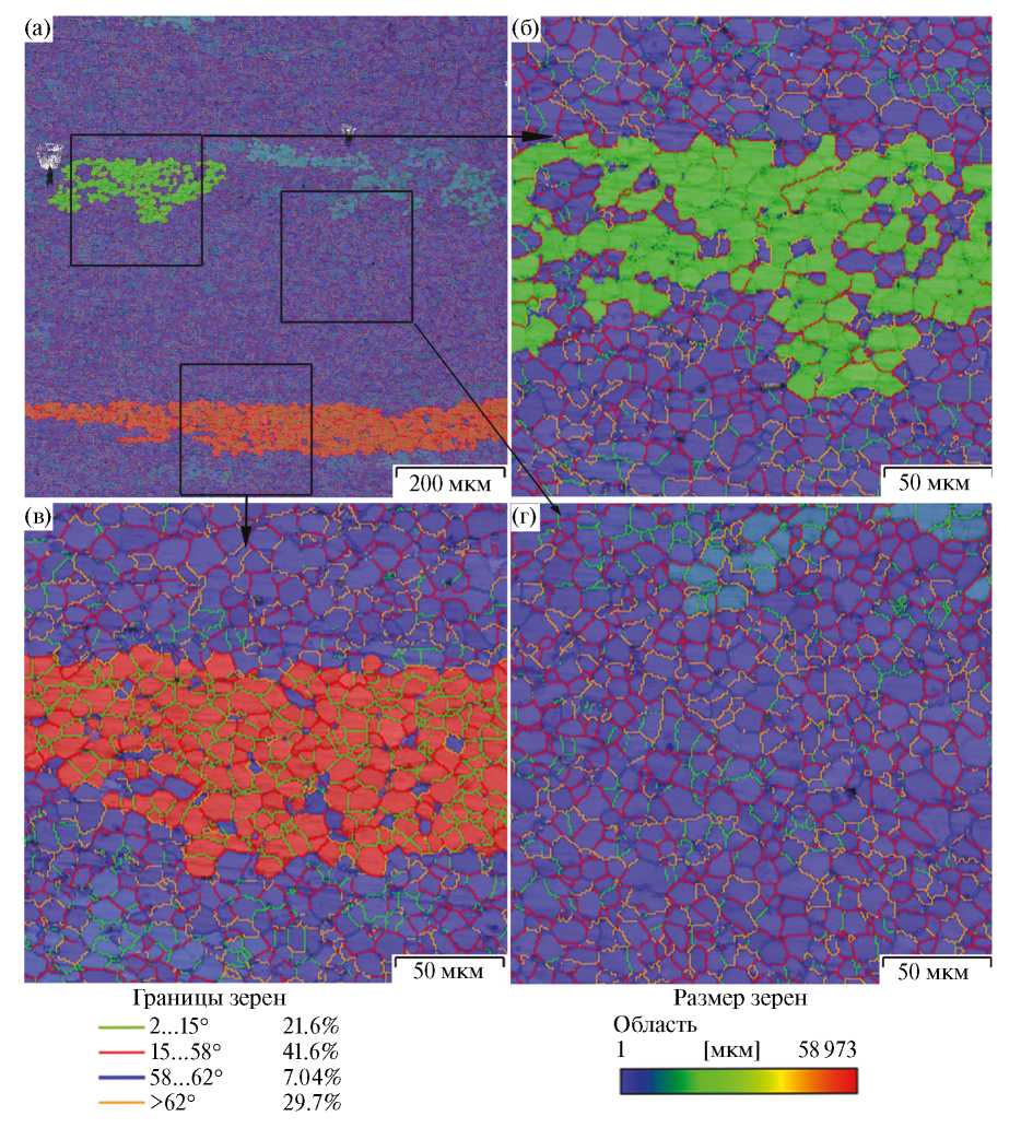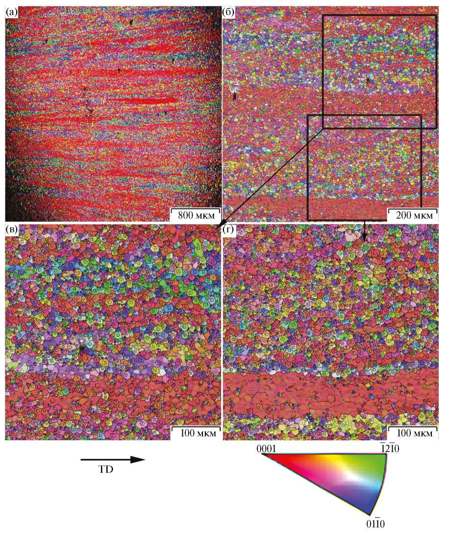 На рис. 5 представлены ДОРЭ-карты в другой модификации: в виде карт распределения α-зерен по кристаллографическим ориентациям, в том числе в виде увеличенных фрагментов ДОРЭ-карты (рис. 5б–г). Совпадение цвета различных α-зерен на ДОРЭ-картах (рис. 5), определяемого стандартным треугольником обратной полюсной фигуры (ОПФ), и совпадение проекций элементарной ячейки α-ГПУ фазы характеризуют близость кристаллографической ориентации данных зерен. Видно, что доминируют более широкие слои близко ориентированных вдоль TD α-зерен с красно-розовой окраской (с полюсами ОПФ, близкими 0001 и 011¯1). Но есть и короткие цепочки зерен одного цвета, которые имеют синюю (полюс 011¯0) или зеленую (полюс 1¯21¯0) цветовые кодировки на ОПФ. Все они отвечают, соответственно, базисной, пирамидальной и призматической плоскостям, которые параллельны плоскости поперечного сечения (RD). Установлено, что при размерной близости α-зерен в плоскости прокатки (ND) и поперечном сечении (RD) их распределение по кристаллографическим ориентациям, определяющее текстуру, принципиально отличается [34].