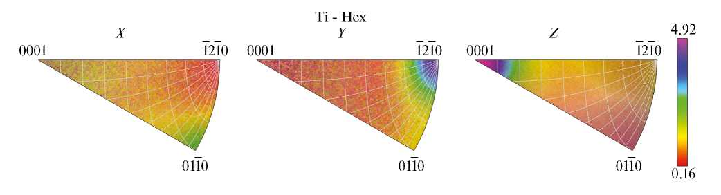 На рис. 8 построены типичные стандартные треугольники обратных полюсных фигур в трех ортогональных проекциях (при Z||RD). Они определяют кристаллографические ориентации α-зерен, залегающих в поперечном сечении (RD). Параллельно оси Z в α-зернах преимущественно ориентированы нормали к базисной плоскости (0001), т.е. c||Z, а при условиях анализа вдоль двух других осей X и Y определяется повышенная полюсная плотность нормалей к указанным на ОПФ призматическим плоскостям (011¯0) или (1¯21¯0). На рис. 8 наряду с основными полюсами также присутствуют многочисленные “рассеянные” полюса, кодируемые желто-красным цветом, заполняющим поля всех треугольников ОПФ. Эти полюса получены от статистически произвольно ориентированных α-зерен.