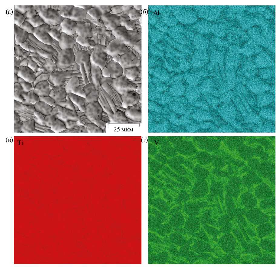 В заключение на рис. 9 показаны карты распределения химических элементов Al, Ti, V, полученные методом рентгеновской энергодисперсионной спектроскопии (ЭДС). Как и в случае плоскости прокатки (ND) для поперечного сечения RD подтверждается локальное обогащение ванадием приграничных областей α-зерен шириной до 2 мкм (рис. 9г), в то время как в теле зерен выше концентрация алюминия и титана (рис. 9б, в).