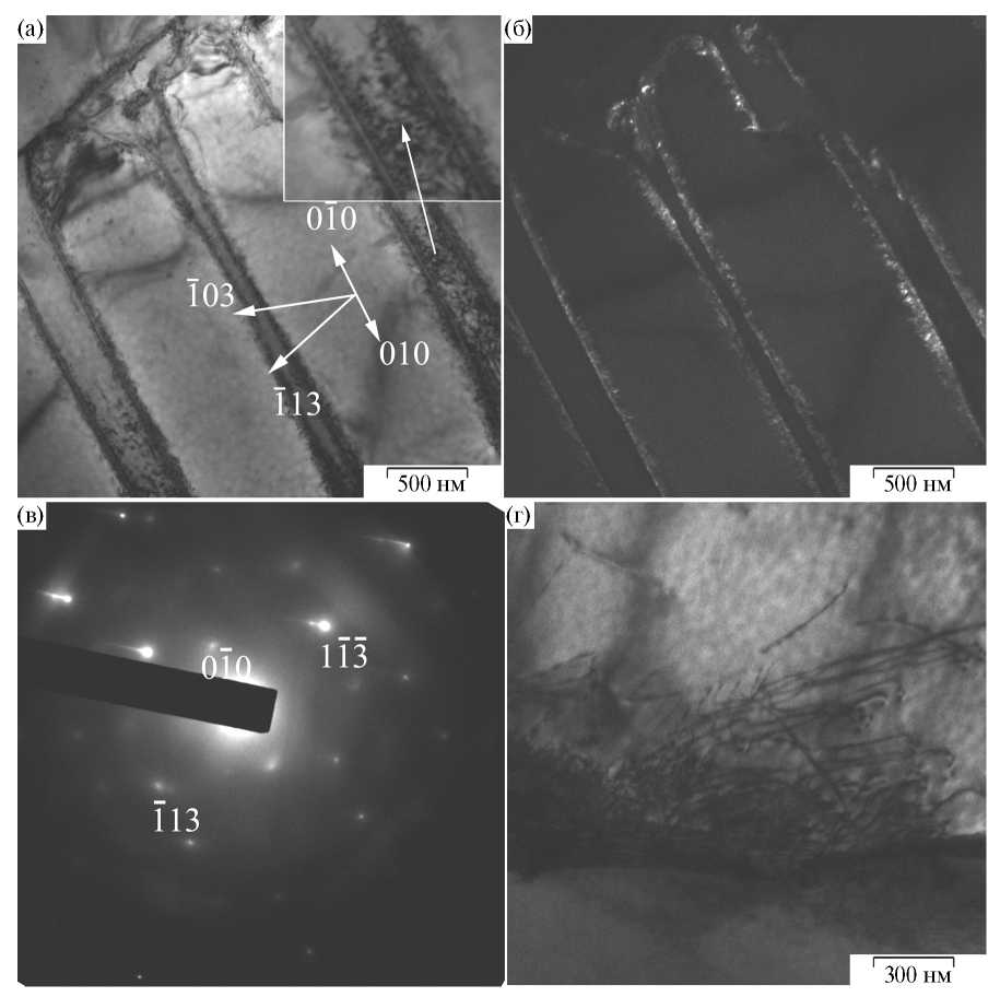 Наконец, светло- и темнопольное ПЭМ-изображения иллюстрируют пакетную морфологию расположенных параллельно тонких двойниковых по плоскости {101¯1} α-пластин (рис. 10а, б), а также дислокационное скопление у границы α-зерен (рис. 10г). Отвечающая двойниковой структуре микроэлектронограмма в плоскости обратной решетки (301) приведена на рис. 10в. В соответствии с ней на рисунке 10а даны результаты следового ориентационного анализа. Дополнительные рефлексы от двойников на микроэлектронограмме не обнаружены, но есть закономерно размытые вдоль одного направления рефлексы a-матрицы.