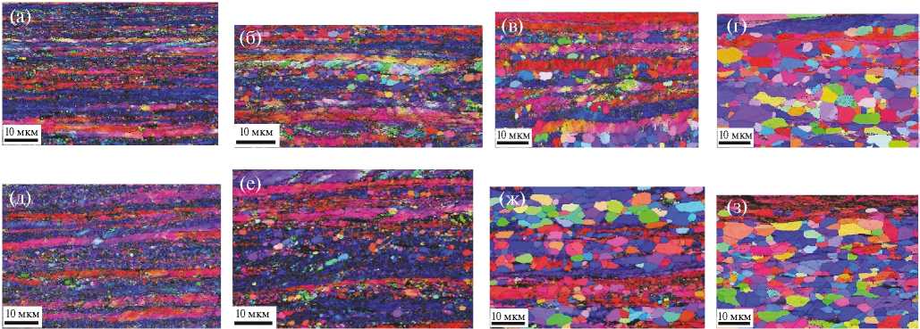 Рис. 1. EBSD-карты в цветах обратной полюсной фигуры (ОПФ), показывающие структуру после нагрева до различных температур для стали А (а–г) и стали В (д–з).