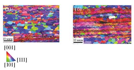Рис. 2. EBSD-карты в цветах обратной полюсной фигуры, снятые на 1/10 (а) и 1/2 (б) толщины образца.