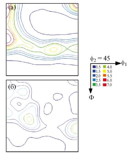 На рис. 7 приведено сечение усредненной ФРО для карт EBSD, снятых на последнем этапе рекристаллизации и отражающих конечную текстуру первичной рекристаллизации. Как видно из данной ФРО, в текстуре преобладают такие компоненты, как {111}<112> и {554}<225>. Именно эти компоненты являются основными для рассмотренных выше диапазонов средних и крупных зерен. Таким образом, показано, как путем преимущественного роста зерен с данными ориентировками формируется итоговая текстура первичной рекристаллизации, в то время как исходно превалирующие на этапе начала первичной рекристаллизации зерна с ориентировками α- и γ-волокна поглощаются (мелкие зерна) и не вносят свой вклад в итоговую текстуру первичной рекристаллизации.