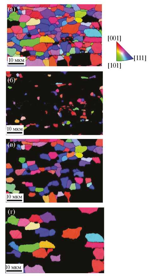 Из визуального анализа ориентационных EBSD-карт в цветах обратной полюсной фигуры (рис. 1) можно сделать следующие наблюдения о протекании процесса рекристаллизации для стали состава А и В: