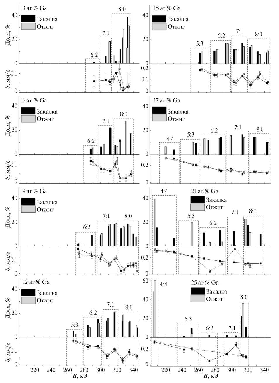 Рис. 2. Гистограммы распределения долей и изомерных сдвигов (δ), соответствующих вкладам основных координаций вокруг атомов железа, таких как 8:0, 7:1, 6:2, 5:3 и 4:4 (объединены штриховыми прямоугольниками), по величине СТП (H), полученные аппроксимацией подспектрами мёссбауэровских спектров образцов сплава железо–галлий, содержащих 3, 6, 9, 12, 15, 17, 21 и 25 ат.% Ga.