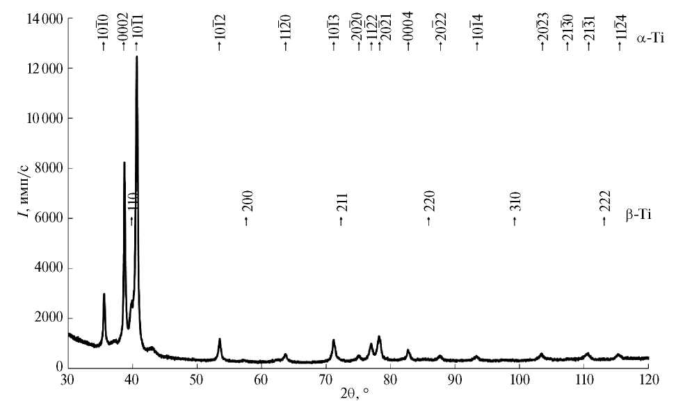 На дифрактограмме, полученной в результате рентгеноструктурного фазового анализа θ/2θ (РСФА), в меньших углах дифракции 2θ на рисунке 1 видны наиболее сильные брэгговские отражения 101, 0002 и 100 α-фазы, определяющие текстуру кристаллографических ориентаций α-зерен в поперечном сечении (TD) вдоль направления прокатки RD. Наличие малых по интенсивности пиков исходной β-фазы 110 и 211 в виде “наплывов” на соседние линии α-фазы 101 и 103 или самостоятельных совсем слабых пиков 200, 220, 310, 222 позволяет заключить, что количество остаточной β-фазы мало и не превышает 3–5 мас.% (рис. 1). Аналогичные результаты РСФА были также нами получены на образцах в плоскости прокатки (ND) и в поперечном сечении (RD), перпендикулярном направлению прокатки RD.