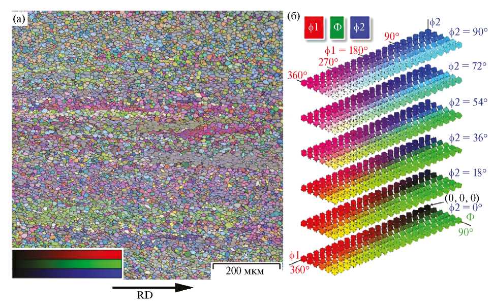 Рис. 4. ДОРЭ-карта и цветная шкала в углах Эйлера (a) и цветовая диаграмма Родригеса–Франка разворотов α-кристаллитов в зависимости от углов Эйлера (б) в поперечном сечении (TD) плиты сплава.