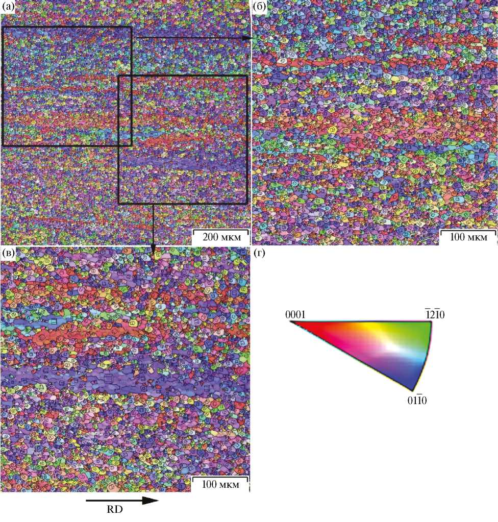 ДОРЭ-анализ в методической модификации, определяющей карту распределения α-зерен по кристаллографическим ориентациям, иллюстрирует рис. 5. Совпадение цвета различных α-зерен на ДОРЭ-картах, задающего ориентацию на стандартном треугольнике обратной полюсной фигуры (ОПФ) (рис. 5), а с другой стороны, согласие ориентировок с выделенными направлениями на проекциях элементарной ячейки зерен α-фазы свидетельствуют о разнообразии и хорошей точности определения кристаллографической ориентации данных зерен. Более широкие слои α-зерен, ориентированные вдоль RD, соответствуют красно-оранжевым цветам полюсов ОПФ 0001 и 011 (рис. 5г). Несколько более узкие или сравнимые по ширине слои α-зерен вдоль RD имеют сине-фиолетовый цвет, близкий к цвету полюса 010. Наиболее короткие и наименее упорядочено расположенные α-зерна имеют зеленый цвет, близкий к цвету полюса 20. В основном цветовая кодировка α-зерен отвечает кристаллографическим плоскостям: базисным (0001), пирамидальным (011) и призматическим (010).