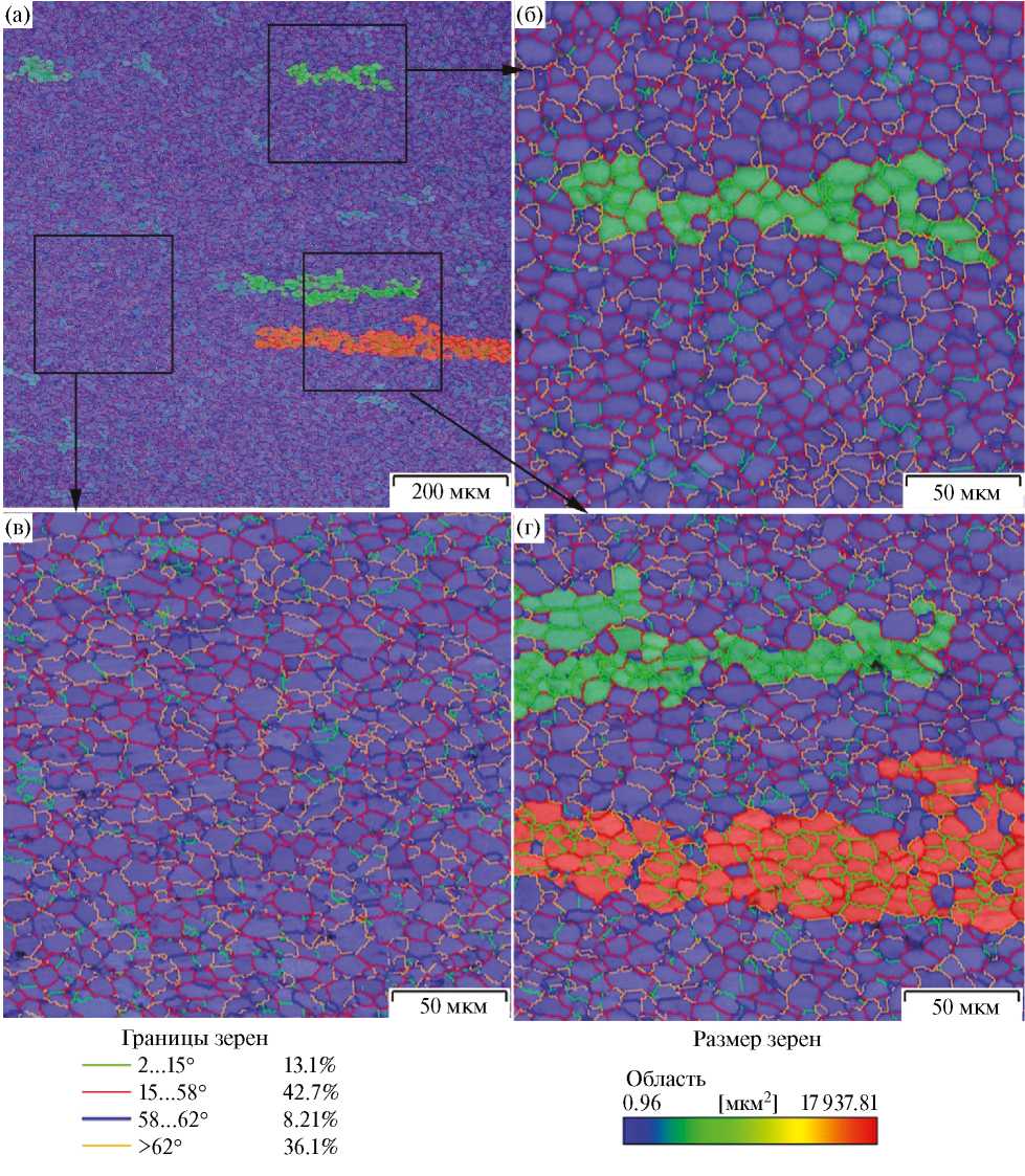 В другом варианте методики ДОРЭ-анализа на рис. 6 размерное распределение зерен задается по их угловой разориентации. Здесь отчетливо видны крупные области с субзеренной структурой, во-первых, выделенные общим цветом для кристаллитов в пределах области, размер которой задан цветовой шкалой справа под рисунком. А во-вторых, в этих областях слабо отличающиеся разориентации кристаллитов друг относительно друга задаются цветом межкристаллитных границ (см. слева под рисунком интервалы малоугловой разориентации в пределах 2–15°). Синим цветом выделены достаточно произвольно ориентированные α-зерна основного массива. Для них другим цветом показаны большеугловые разориентации границ в трех диапазонах углов (слева под рисунком — 15–58°, 58–62°, больше 62°).