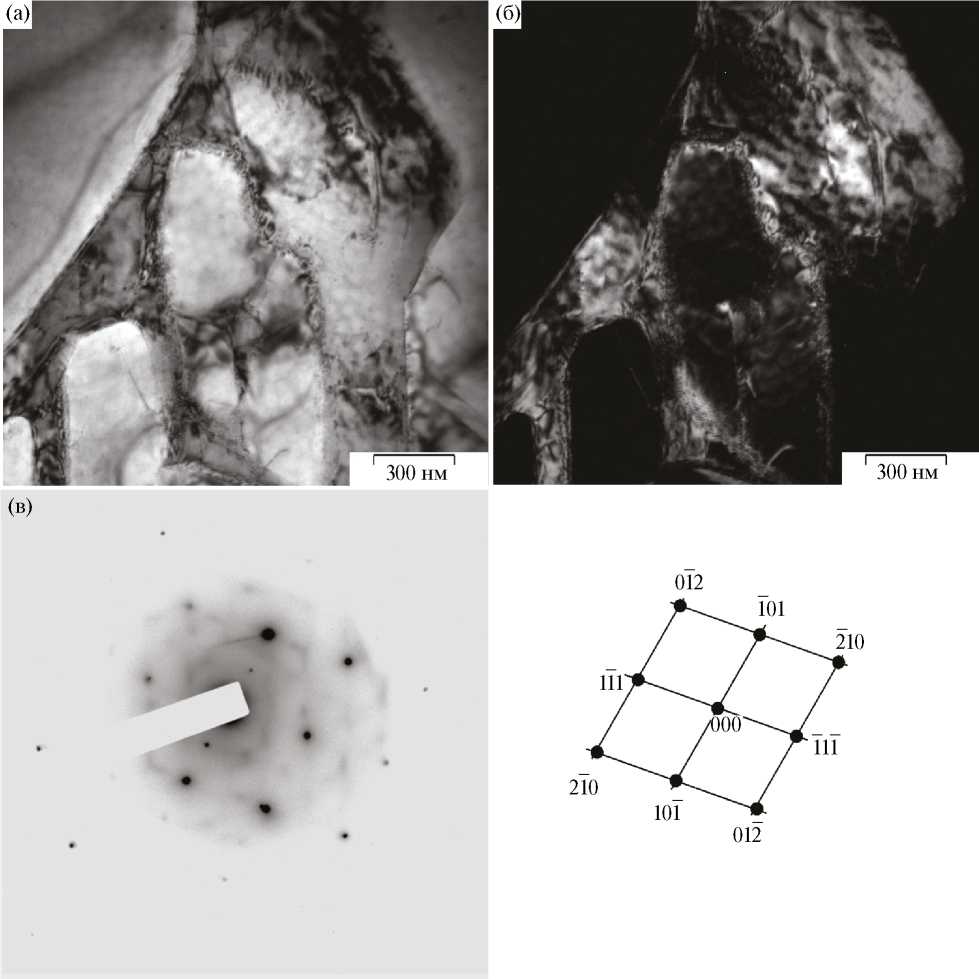 В заключение на рис. 9а, б иллюстрируются светло- и темнопольное ПЭМ-изображения особенностей субмикронных зерен α-фазы. На рис. 9а, б видна дислокационная субструктура только у границ глобулярных α-зерен. Т. е. формирующиеся при ТМО α-зерна практически свободны от дислокаций, из чего следует, что основным при их росте является диффузионный механизм глобуляризации и возможной рекристаллизации. Но поскольку процесс горячей прокатки является практически непрерывным, дислокационный механизм собственно пластической деформации исключить нельзя, и он проявляется в локализации дислокаций в виде скоплений на границах зерен [33, 34]. При этом из 3D-реконструкции формы зерен по данным ОМ-, РЭМ- и ПЭМ-исследований следует, что они имеют глобулярную форму во всех трех проекциях. На рис. 9в приведена соответствующая микродифракция электронов и ее схема в плоскости обратной решетки (121).