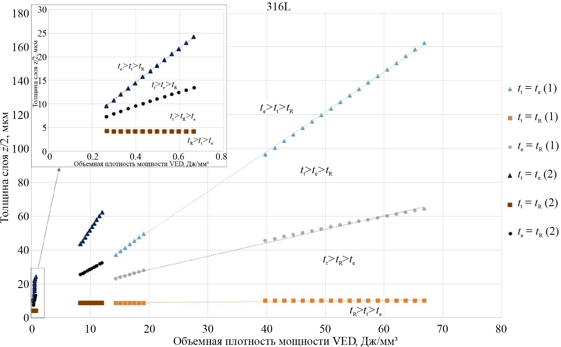 Из рис. 1 видно, что для сплава Ti6Al4V при малых значениях удельной плотности мощности и малых толщинах слоя (соответствующих малому размеру частиц порошка) определяющую роль играет процесс растекания расплава, а при больших толщинах слоя – процесс поглощения энергии, необходимой для расплавления tе. С ростом удельной плотности мощности между ними возникает область, в которой определяющую роль играет конвекция Марангони, и размер этой области увеличивается с ростом удельной плотности мощности.