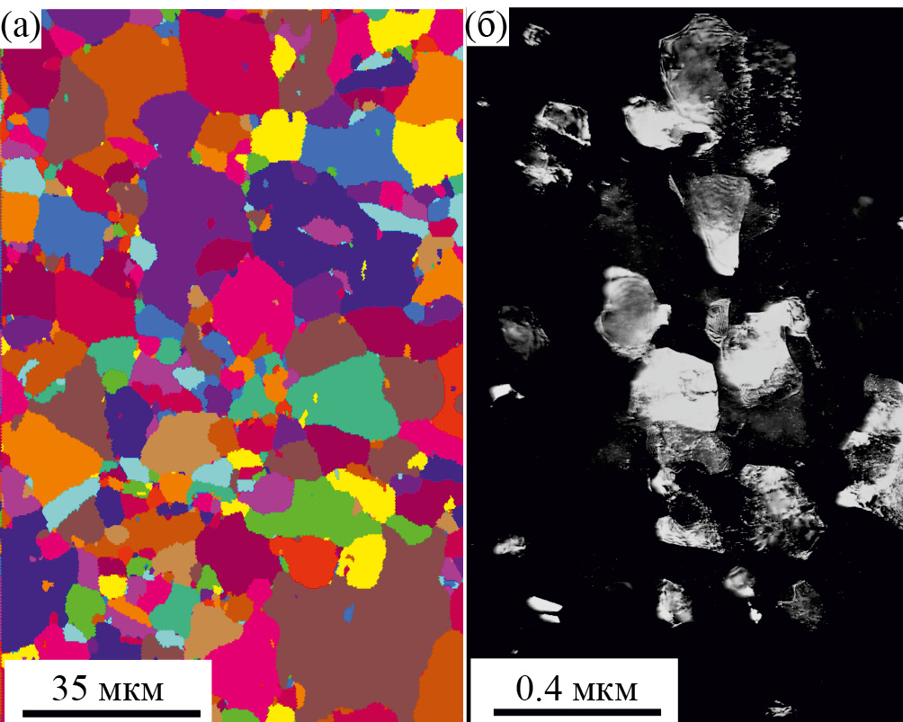 4. Рис. 3. Микроструктура никеля (а) и сплава Ni–2Cr (б) после деформации СПД и отжига при 200°С, 1 ч; а – EBSD-карта зерен в произвольных цветах, СЭМ; б – темнопольное изображение в рефлексе типа (111)γ, ПЭМ.