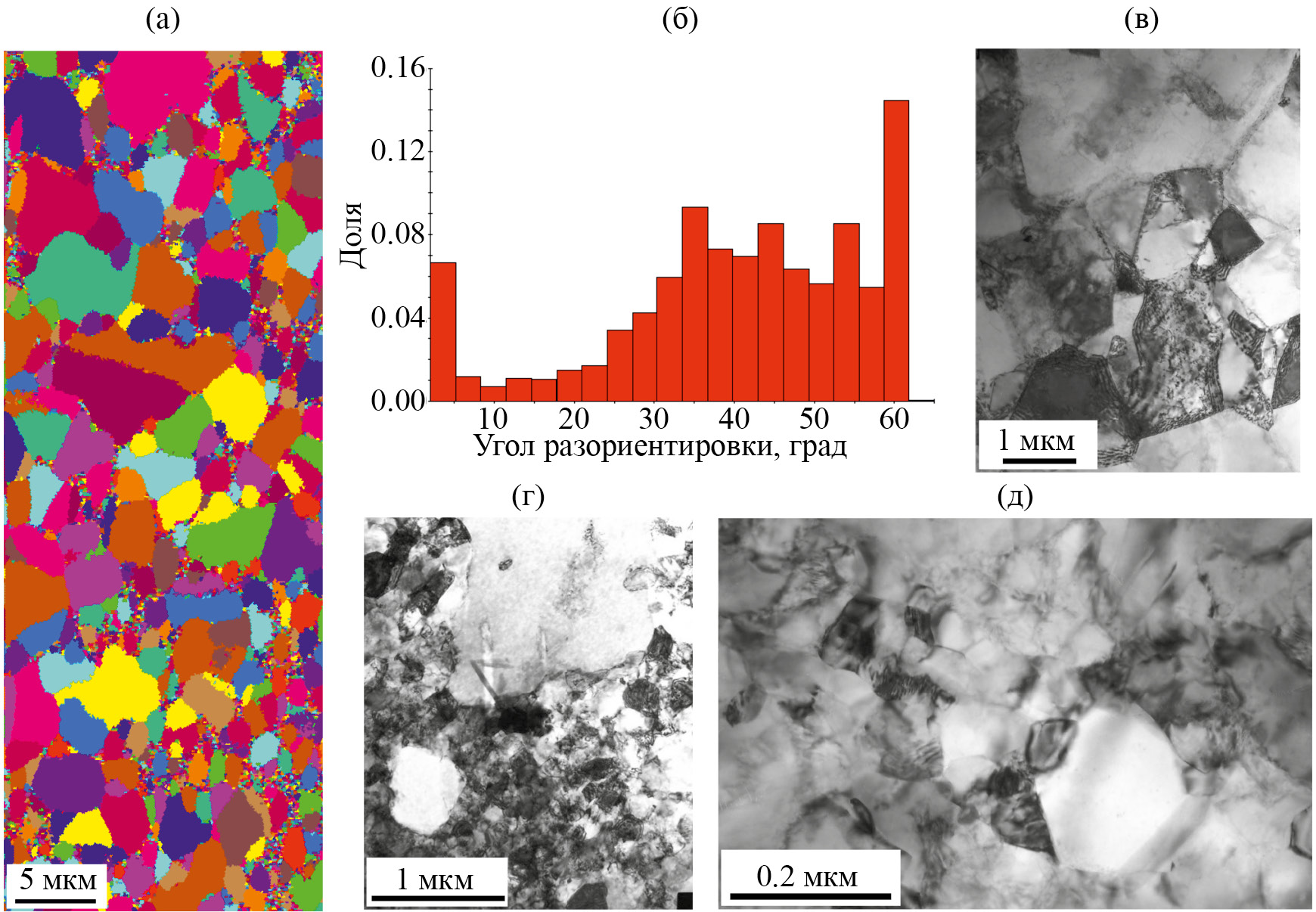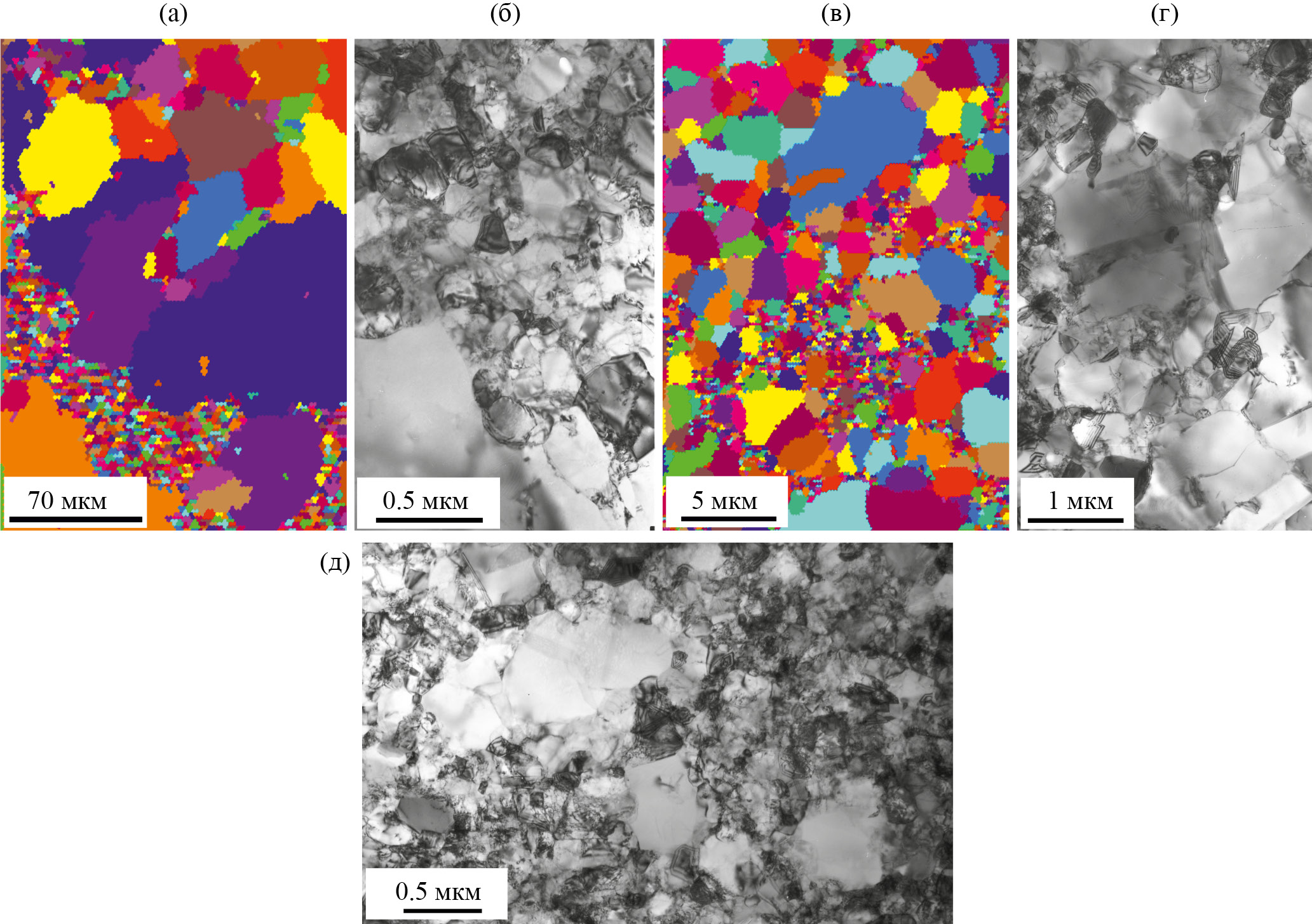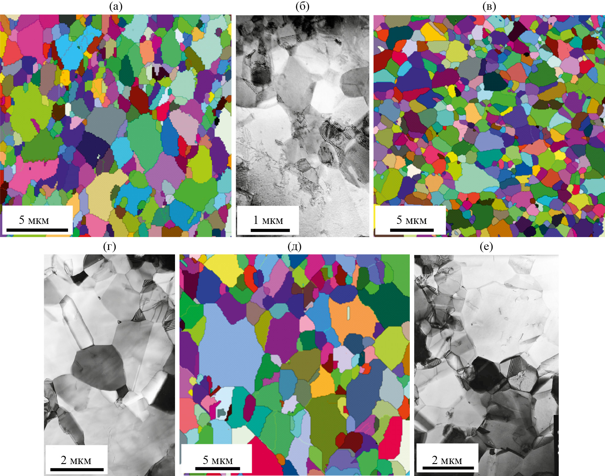 6. Рис. 5. Микроструктура сплава Ni–2Cr (а, б), Ni–5Cr (в, г) и Ni–12.5Cr (д) после деформации СПД и отжига при 400°С, 1 ч; а, в – EBSD-карты зерен в произвольных цветах, СЭМ; б, г, д – светлопольные изображения, ПЭМ.