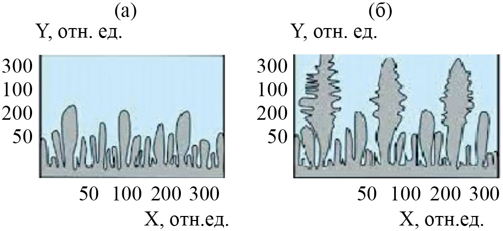 Предложенные модели также позволяют произвести оценку размеров сформированных дендритов. Переходя к абсолютным размерам с учетом длины стороны ячейки расчетной области 10 нм, получаем значения радиусов окружностей минимального покрытия для островковых дендритных структур порядка 100–400 нм. Эти величины при выбранном размере расчетной ячейки не противоречат данным, наблюдаемым в экспериментах.