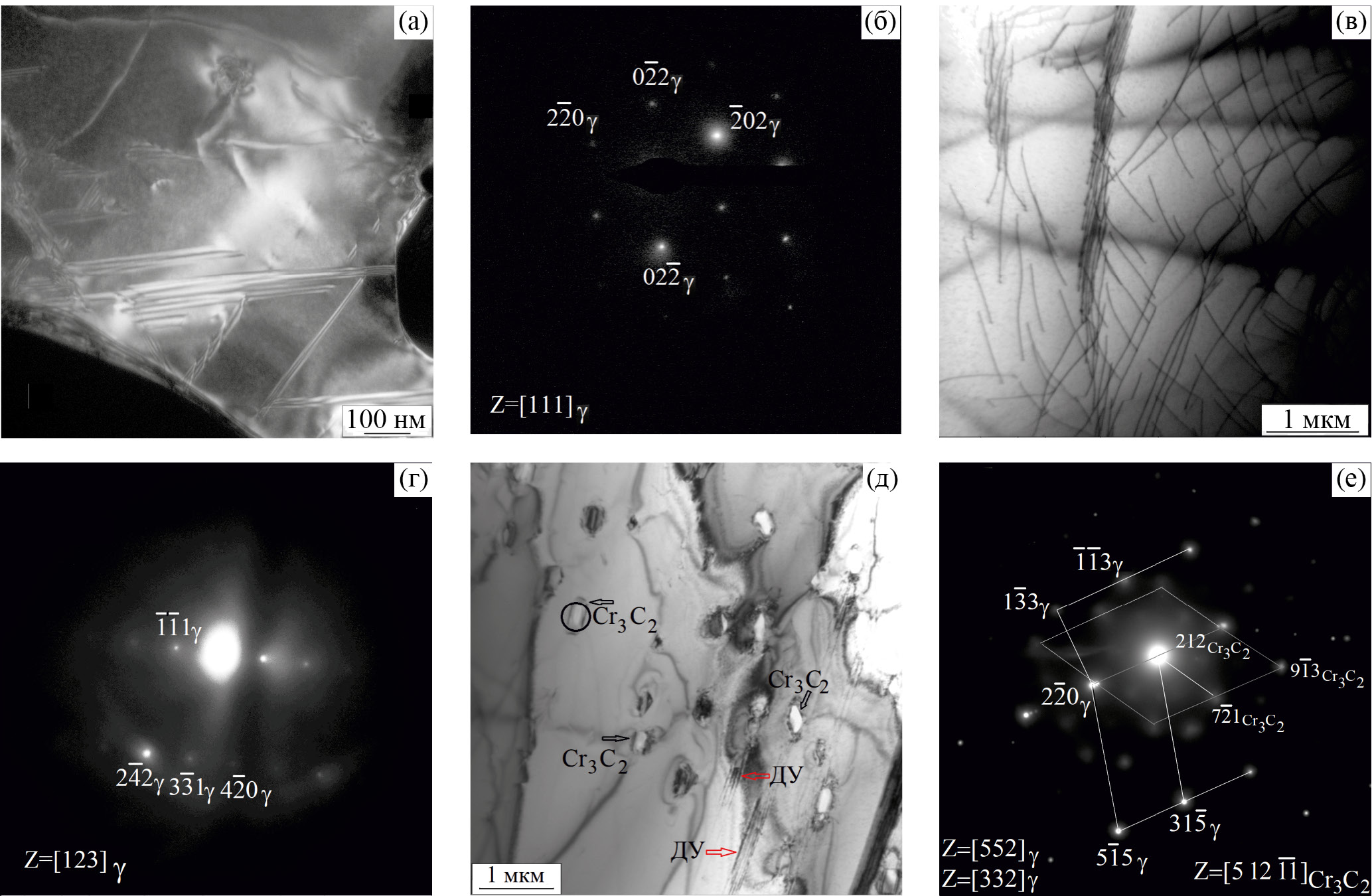 ДУ шириной до 300 нм наблюдаются в структуре стали после охлаждения в жидком азоте, рис. 3а, б. Дислокации распределены неравномерно, образуют сетки и дислокационные стенки, рис. 3в, г. Плотность дислокаций в областях их скопления составляет около 5×109 см−2. ДУ образуются также в местах локализации напряжений на межфазных границах, разделяющих карбиды и матрицу, рис. 3д, е. На электронограмме, рис. 3е, наряду с сетками рефлексов аустенита присутствует сетка рефлексов карбидов, идентифицированных как Cr3С2. Этот карбид имеет орторомбическую решетку. Межплоскостные расстояния, определенные по электронограмме: d=1.33 Å, d=1.26 Å и d=0.75 Å, совпадают с табличными данными ICDD файла (карта 3-935) [26] и соответствуют кристаллографическим плоскостям с индексами (212), (71) и (913). Совпадают также величины экспериментально измеренного и рассчитанного угла между направлениями [212] и [71], равного 60.7 градусов. Частицы нитридов Cr2N после закалки не наблюдались, что свидетельствует о переходе атомов азота в твердый раствор. Аналогичные результаты были получены при исследовании Cr–Mn-стали c еще более высоким (0.83%) содержанием азота [27].