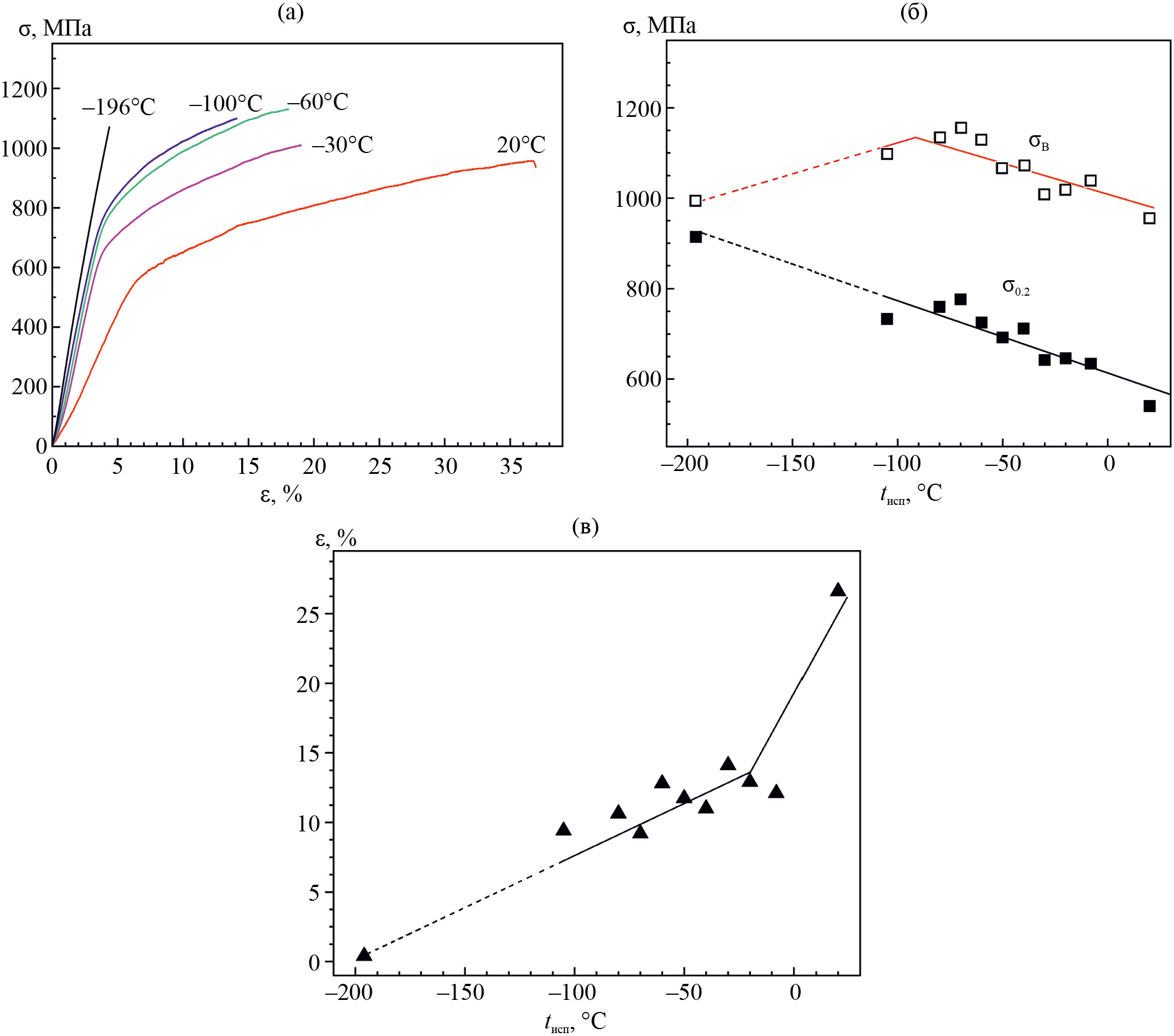 Рис. 5. Кривые σ–ε Cr–Mn–C–N-стали, испытанной на растяжение при разных температурах (а); температурные зависимости предела прочности σв и предела текучести σ0.2 (б) и относительной деформации ε (в).