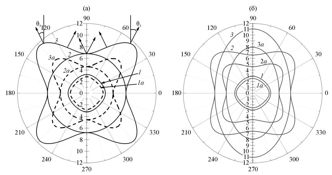 Рис. 1. Угловые зависимости изоэнергетических поверхностей (10–5 с/см) для кристаллов: Au (кривые 1, 2, 3), Ag (кривые 1а, 2а, 3а). Для продольных – кривые 1, 1а и 1b, быстрых – кривые 2, 2а и 2b и медленных поперечных фононов – кривые 3, 3а и 3b: (а) для волновых векторов в плоскости грани куба; (б) для волновых векторов в диагональной плоскости.