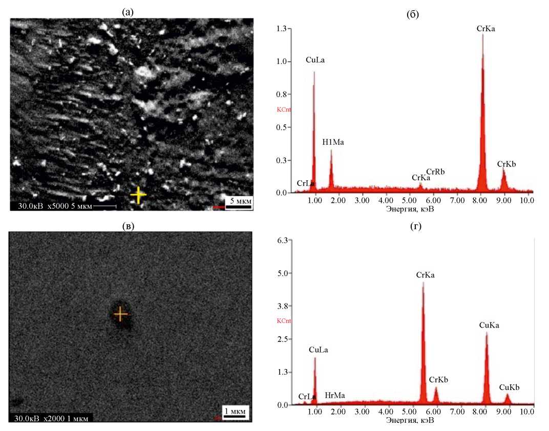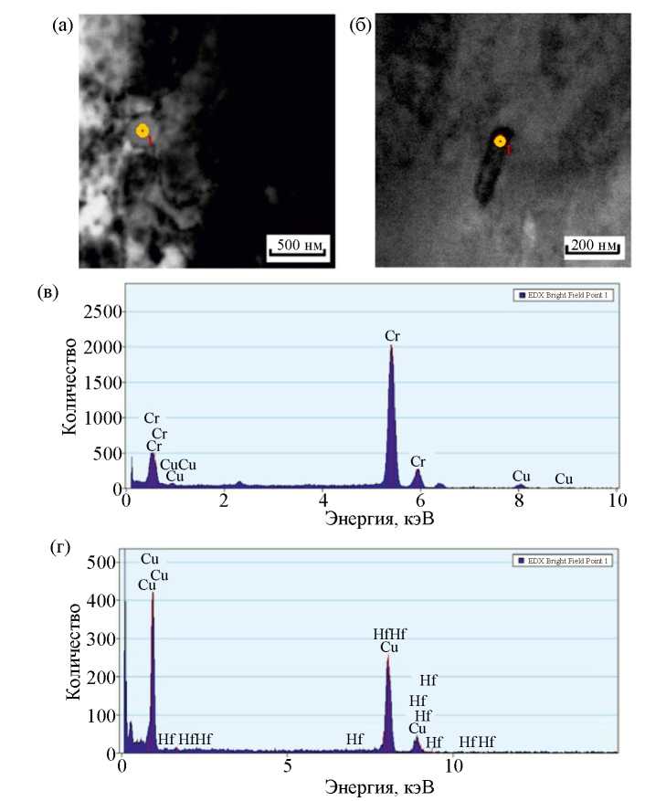 После закалки в структуре уже не обнаруживаются выделения интерметаллида Cu5Hf, но сохраняется небольшое количество крупных выделений Cr. На рис. 1в, г видно, что в структуре отсутствуют мелкие выделения, а отмеченная крупная частица идентифицирована как выделение хрома.