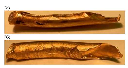 Внешний вид образцов после ДКУП представлен на рис. 2. Они идентичны образцам гафниевой бронзы, исследованным в [19]. После 1 прохода поверхность образцов достаточно ровная и гладкая, без задиров и трещин. Цилиндры вытягиваются и немного прогибаются, что характерно для этого способа деформации (рис. 2а). После двух проходов цилиндры еще больше вытянуты и изогнуты, и на внутренней поверхности появляются небольшие задиры, но трещин нет (рис. 2б).