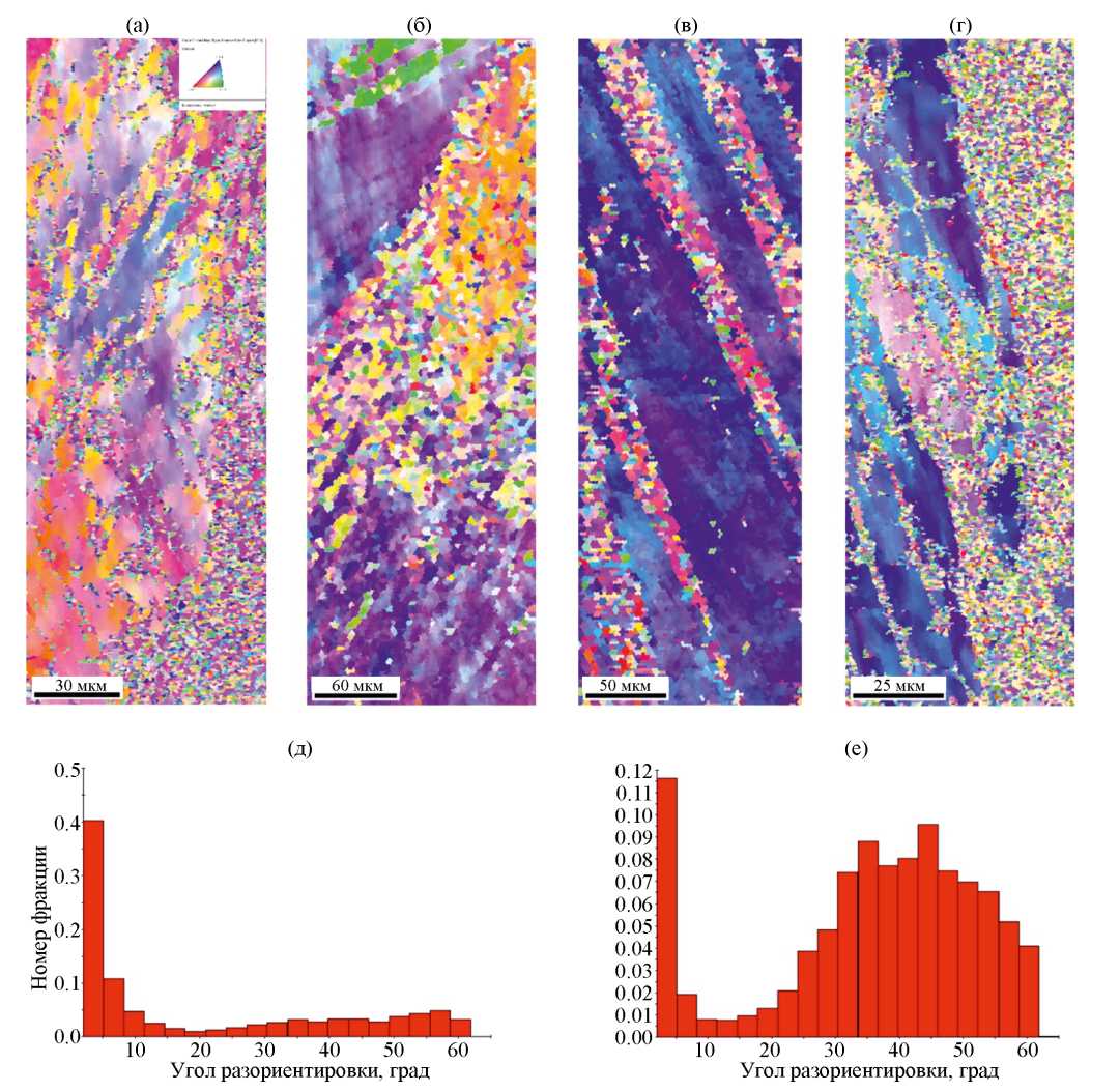 Широкие полосы с малыми разориентировками сохраняются и после 2 проходов ДКУП, но границы между ними становятся более четкими (рис. 3в, г). Внутри этих полос наблюдается значительное измельчение структуры, сильно разориентированные фрагменты мельче, чем после 1 прохода. При этом доля высокоугловых границ заметно увеличивается (до ~ 40 %) (рис. 3е).
