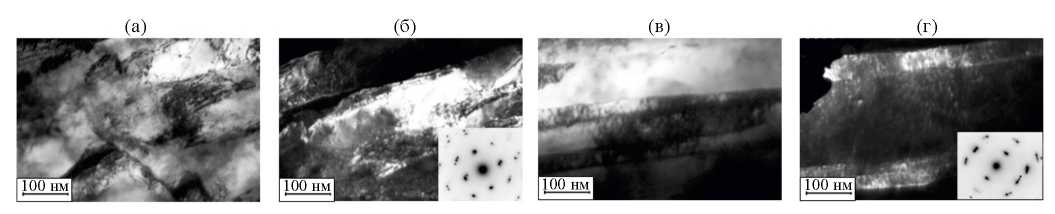 Структура хромогафниевой бронзы после 1 прохода ДКУП представлена на рис. 4. Можно выделить участки двух типов, которые свидетельствуют о действии двух механизмов деформации: скольжения и двойникования. Участки с ячеистой структурой представлены на рис. 4а, б. Ячейки имеют широкие дислокационные границы, по форме ячейки близки к равноосным или слегка вытянуты. Размеры некоторых ячеек достигают 1 микрона. На других участках ячейки соседствуют с двойниками или преобладают широкие двойники (рис. 4в, г). Электронограммы в этом образце, в основном, точечные, от одной из плоскостей обратной решетки. Иногда на них наблюдается азимутальное размытие рефлексов или близкорасположенные на кольце рефлексы, что свидетельствует о малоугловой разориентировке ячеек.