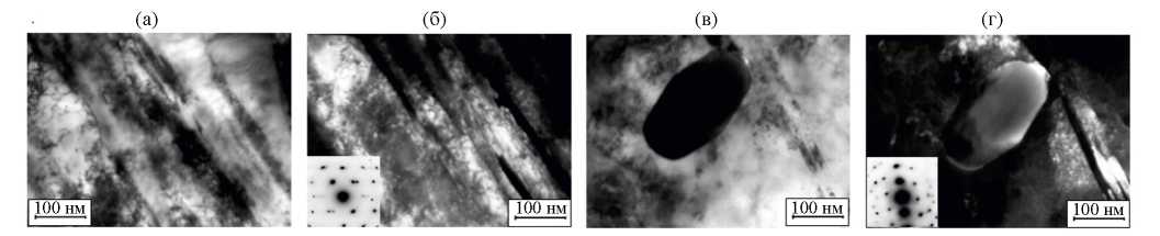 Рис. 4. Структура хромогафниевой бронзы после 1 прохода ДКУП: а, в – светлые поля; б, г – темные поля в рефлексах (200)Cu и (220)Cu, соответственно, и электронограммы, оси зон [001] и [112].