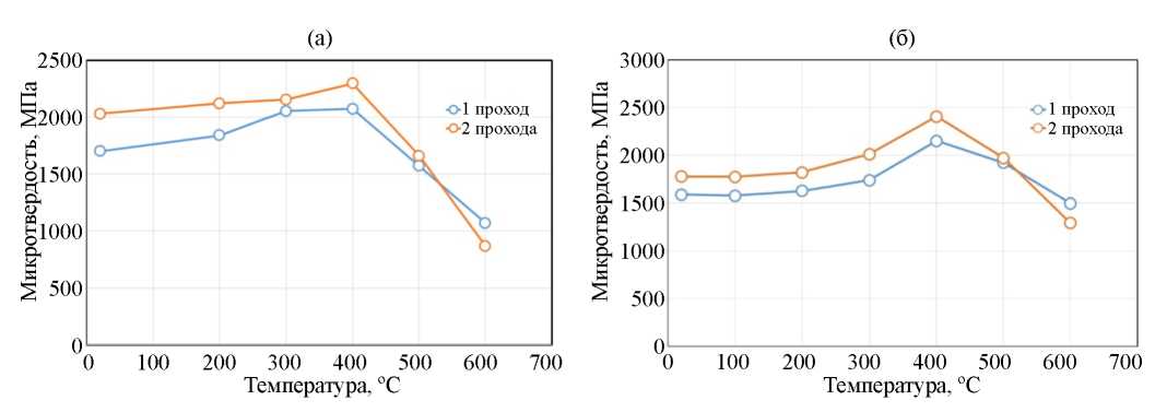 Рис. 6. Влияние температуры отжига на микротвердость гафниевой (а) и хромогафниевой (б) бронзы, подвергнутой ДКУП.
