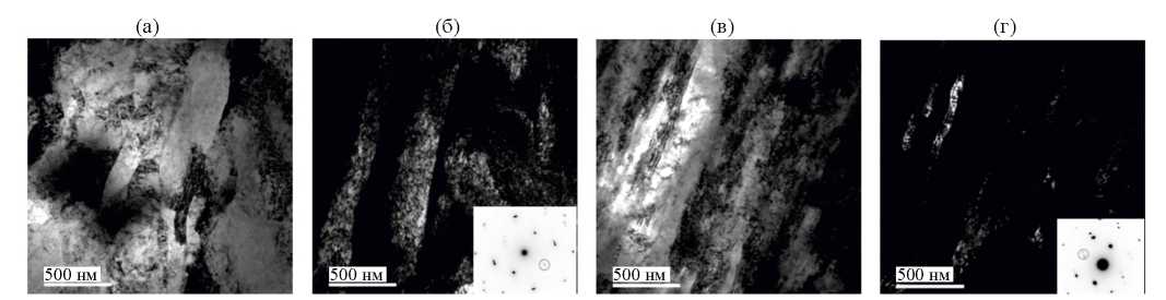 Рис. 8. Структура хромогафниевой бронзы после ДКУП 2 прохода и отжига 400°С, 2 ч: а, в – светлые поля, б – темное поле в рефлексе (002)Cu, ось зоны [100], г – темное поле в рефлексах (002)Cu и Cu5Hf, обозначенных кружком на электронограмме.