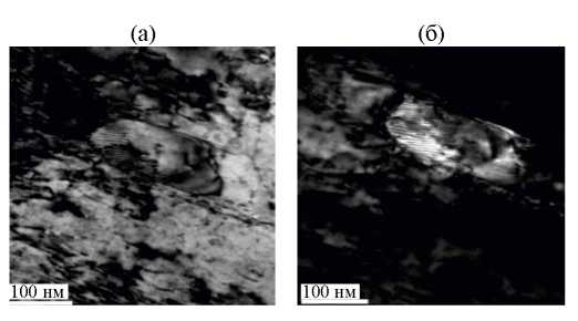 Рис. 9. Структура хромогафниевой бронзы после ДКУП 2 прохода и отжига 400°С, 2 ч: а – светлое поле, б – темное поле в рефлексе (002)Cu.