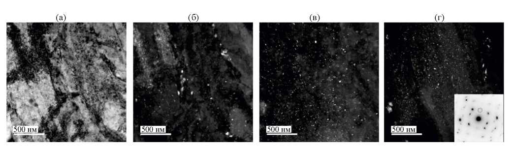 Рис. 11. Структура хромогафниевой бронзы после ДКУП 2 прохода и отжига 600°С, 2 ч: а – светлое поле, б – темное поле в рефлексах (002)Cu и Cu5Hf, в – темное поле в рефлексах Cu5Hf, г - темное поле в рефлексах (002)Cu и (110)Cr.