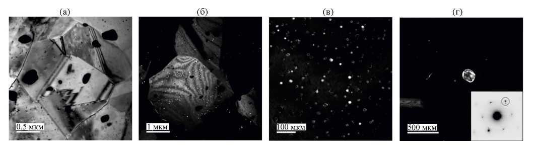 Рис. 10. Структура хромогафниевой бронзы после ДКУП 2 прохода и отжига 500°С, 2 ч: а – светлое поле, б – темное поле в рефлексах (111)Cu и (110)Cr, в, г – темные поля в рефлексе Cu5Hf, обозначенном кружком на электронограмме.