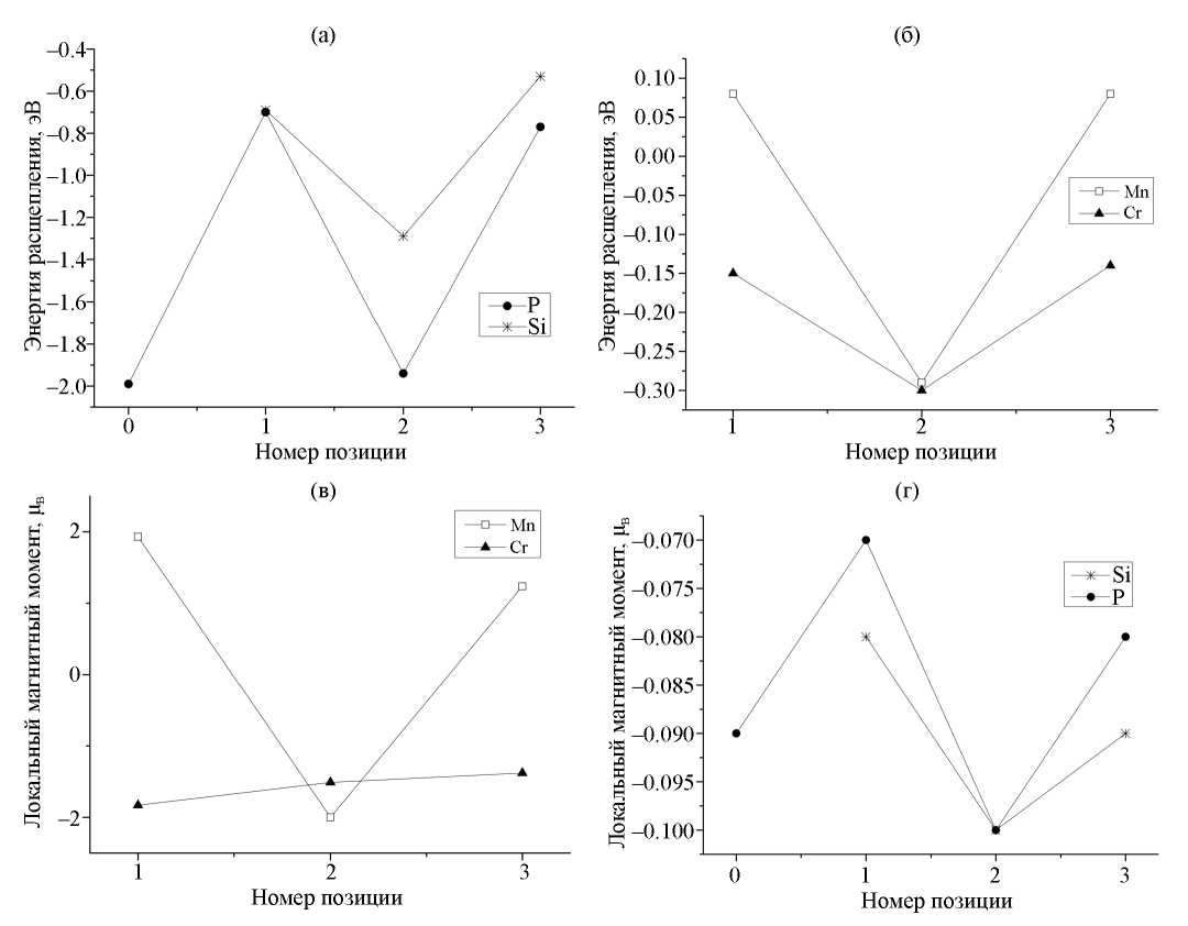 Графики зависимости энергии растворения примеси (по формуле 1) и локального магнитного момента примеси от номера позиции представлены на рис. 3 и 4. Прежде всего отметим, что одинаково низкая энергия растворения P в позициях 2 и 0 позволяет атому фосфора оказываться в ОЦК-Fe как в позиции растворения (2), так и в позиции внедрения (0). Видно, что все примеси имеют наименьшую энергию растворения в позиции 2 с пониженным значением объема многогранника Вороного. Для примесей Si и P, которые имеют атомный радиус, значительно меньший, чем радиус атомов железа [44], это не удивительно, поскольку в позиции 2 они могут образовывать ковалентные связи с 3d-электронами Fe, что объясняет появление небольшого магнитного момента на примесях. Для примесей же хрома и марганца выбор позиции 2 продиктован, скорее, магнитным эффектом.