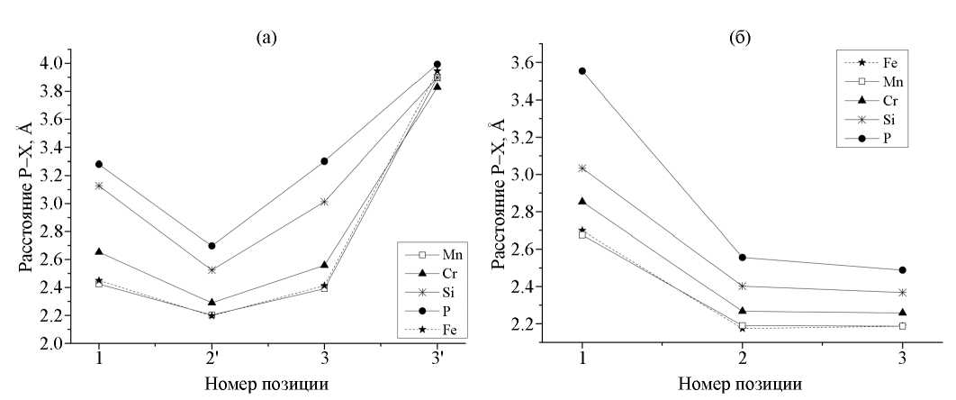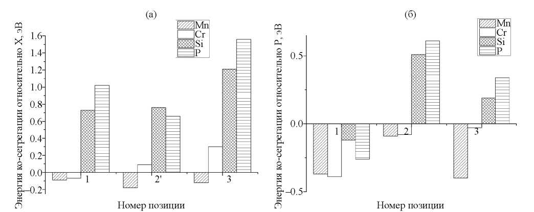 8. Fig. 7. Change in co-segregation energy depending on the position number of X atoms (X=Mn, Cr, Si, P) at the Σ5(310) grain boundary: (a); (b). The phosphorus atom is in position 2.