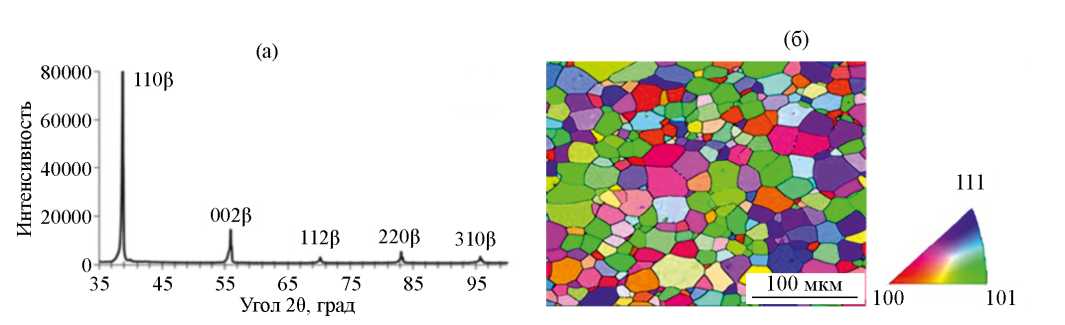 Анализ дифрактограммы и данных ориентационной микроскопии (рис. 2), показал, что после закалки сплав Ti–26Nb имеет однофазное β-состояние, в структуре наблюдаются полиэдрические β-зерна средним размером 16±2 мкм и с преимущественной ориентацией <110>β вдоль направления нормали (НН) к плоскости съемки (рис. 2б). ОЦК-решетка β-твердого раствора имеет период 0.3281 ± 0.0004 нм.