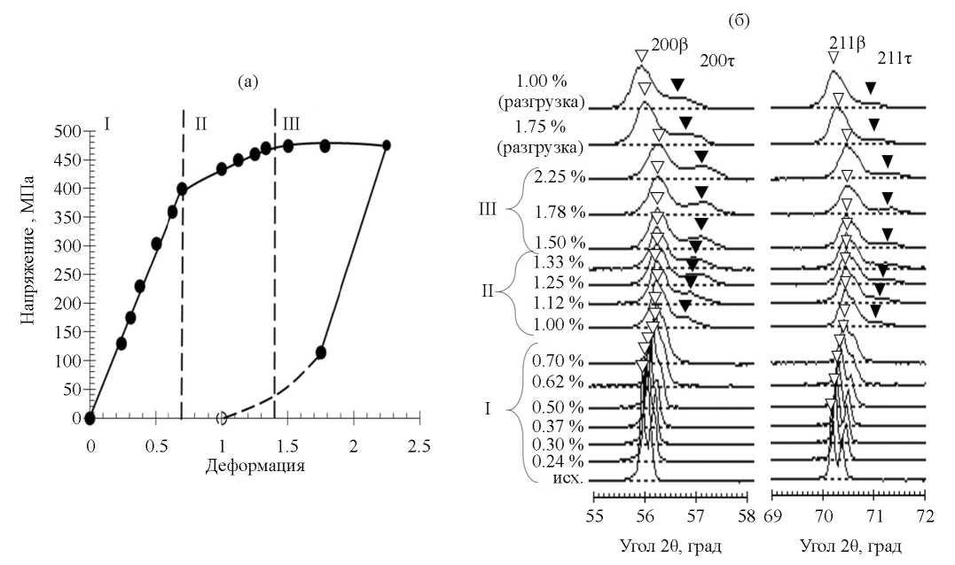 II интервал значений деформации 0.7–1.4% (рис. 3) связан с протеканием ДИП β→τ, образующейся по сдвиговому механизму, как и в сплавах с механически нестабильной β-фазой в работах [8–12]. На приведенном участке дифрактограмм, снятых в этом интервале деформаций, наблюдается появление дополнительных линий (рис. 3б). В случае образования тетрагональной фазы – это линии 200τ и 211τ. Образование τ-фазы при деформации отражается на кривой “напряжение-деформация” (рис. 3а) в виде отклонения от линейной зависимости, характерной для упругой деформации. Подобные линии HKL фиксировали при РСФА исследовании in situ во время испытания на растяжение β-титанового сплава Ti–30Nb–10Ta–5Zr (мас. %) [18]. Их появление авторы объясняли возникающими искажениями решетки β-твердого раствора титана в ходе деформации.