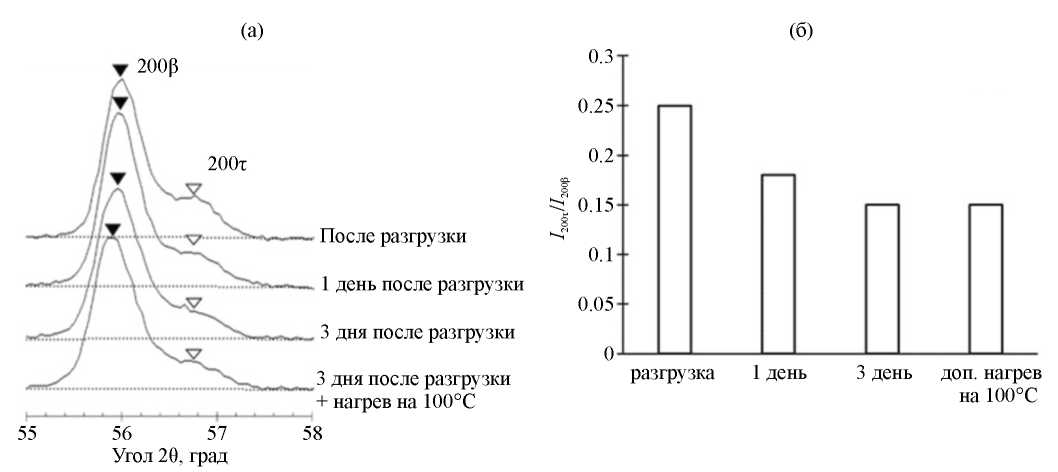 После разгрузки сплава Ti–26Nb наблюдается снятие тетрагональных искажений (сβ /аβ=1 – см. рис. 4б) решетки β-твердого раствора, наведенных упругими напряжениями в ходе растяжения. При этом дефекты, накопленные в ходе пластической деформации, сохраняются. На это указывает более высокий уровень уширения линии 200β после растяжения и разгрузки по сравнению с закаленным состоянием (рис. 3б). На дифрактограмме после разгрузки сохраняются линии τ-фазы (рис. 6а–в качестве примера представлена линии 200τ), которые, исходя из снижения интенсивности линия 200τ после разгрузки (рис. 6б), частично претерпевает обратное τ→β-превращение. На дифрактограмме, записанной после трех дней вылеживания после разгрузки образца, линии τ-фазы фиксируются, но еще более низкой интенсивности (рис. 6б), что свидетельствует об уменьшении ее объемной доли в сплаве. Последующий нагрев на 100°С не приводит к развитию обратного τ→β-превращения. Отношение периодов c/a ОЦТ-решетки τ-фазы после разгрузки составило 1.036 (рис. 4б), как и в момент фиксации ее образования при наложении деформации в 1 %.