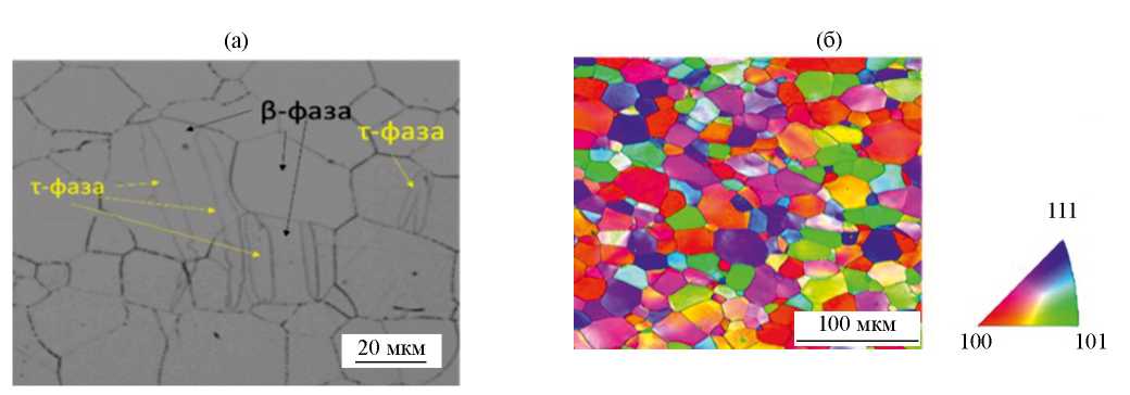 Рис. 7. Структура сплава (а) и ориентационная микроскопия (б) сплава Ti–26Nb после испытания на растяжение и последующего вылеживания в течение 3 дней.