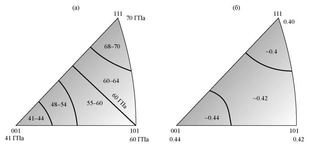 Рис. 8. Контур графики рассчитанного модуля упругости (а) и коэффициента Пуассона (б) ОЦК-решетки β-твердого раствора сплава Ti–26Nb в зависимости от ориентации.