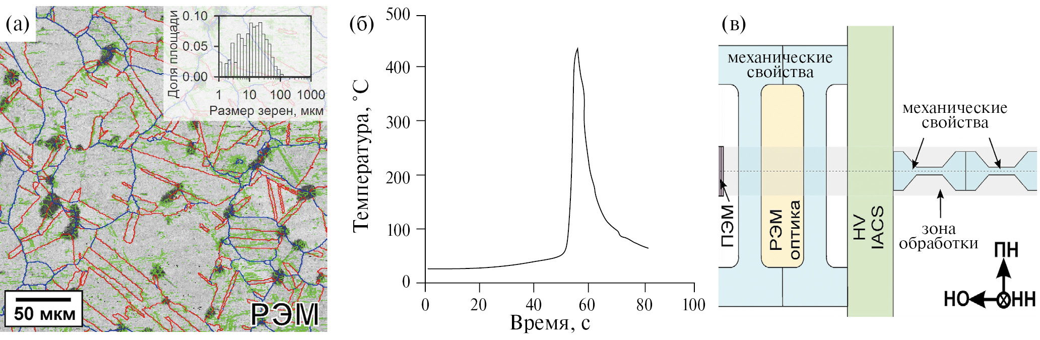 Рис. 1. (а) — исходная структура Cu–Cr–Zr-сплава после обработки на пересыщенный твердый раствор; (б) — термический цикл процесса ОТП; (в) — схема вырезки образцов для исследований. Малоугловые границы от 2° до 15° обозначены зелеными линиями, большеугловые границы более 15° — синими линиями, и двойниковые границы S3 — красными линиями (on line). Система координат: НО — направление обработки; ПН — поперечное направление; НН — направление нормали к плоскости обрабатываемых заготовок.