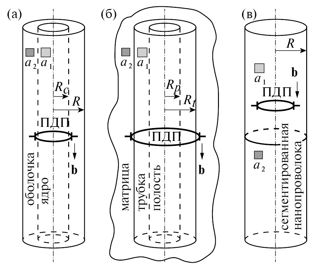 В случае нанопроволок рассматривали сплошные, свободно стоящие цилиндрические нанопроволоки типа “ядро–оболочка” (рис. 2а) [41] и нанотрубки, внедренные в упругую матрицу (рис. 2б) [43]. Все перечисленные выше модели [41–49] предполагали упругую однородность и изотропию композитных наночастиц и нанопроволок. Исследовать влияние различий в упругих модулях ядра и оболочки на критические условия образования петель ДН удалось пока только в рамках приближенных моделей [39].