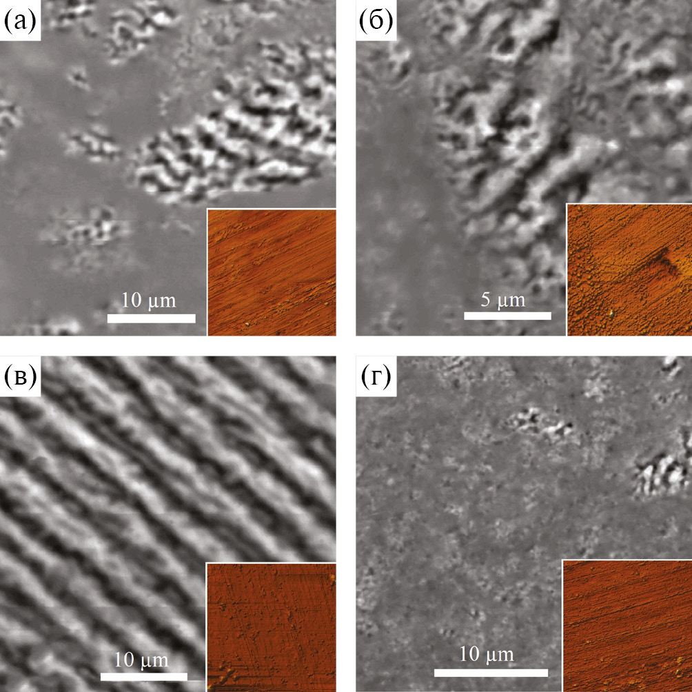 Рис. 1. МСМ-изображения образцов, синтезированных при 1 (а, б) и при 10 (в, г) оборотах наковальни при комнатной температуре (а, в) и при температуре жидкого азота (б, г). На внутренних рисунках показаны топографические карты соответствующих областей.