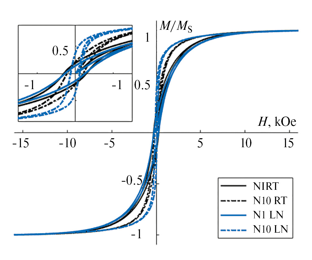 Результаты вибрационной магнитометрии синтезированных образцов представлены на рис. 2. Для сплавов, полученных при одном обороте наковальни, кривые намагничивания имеют схожий вид для обеих температур механосинтеза, тогда как для сплавов, синтезированных при больших сдвиговых деформациях (число оборотов наковальни N=10), кривые намагничивания в продольном магнитном поле становятся более прямоугольными и площадь петли гистерезиса уменьшается.