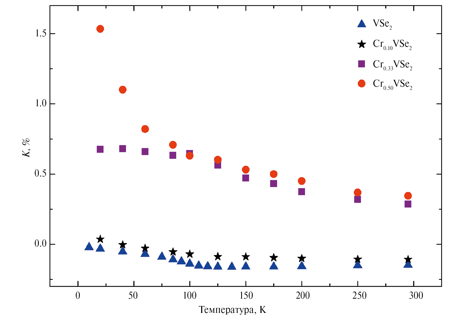 Рис. 7. Зависимость сдвига линии ЯМР на ядрах 51V в CrxVSe2 (x = 0; 0.10; 0.33; 0.50) от температуры.