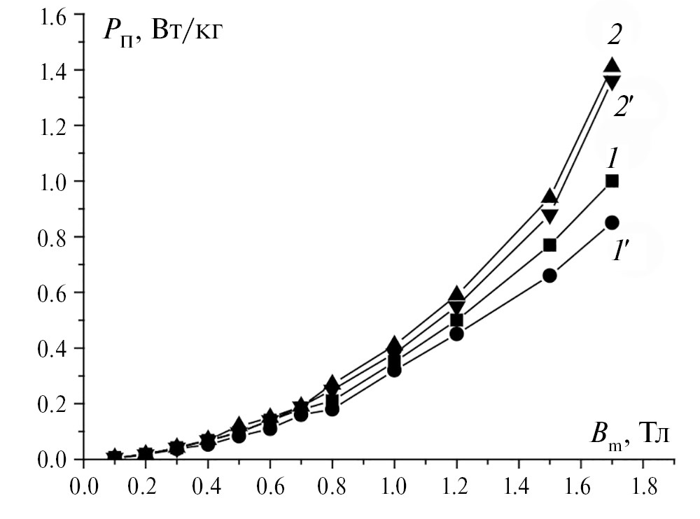 Рис. 4. Зависимость изменения полных магнитных потерь от индукции. Образец ст. 3407 (0.27 мм). (f = 50 Гц): 1, 2 – до обработки, 1ʹ, 2ʹ – после обработки поверхности.