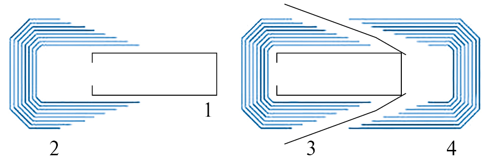 Все рассмотренное выше свидетельствует, что при изготовлении шихтованных магнитопроводов целесообразно проводить сначала вырезку полос АЭС до необходимых размеров, проводить отжиг для снятия механических напряжений, и лишь после этого проводить нанесение структурных барьеров на участки полос с максимальным значением магнитной проницаемости. Такая же последовательность обработки АЭС должна соблюдаться при изготовлении витых магнитопроводов. Например, на заводе силовых трансформаторов “Протон”, г. Владимир, магнитопроводы изготавливаются по технологии Unicorn (Единорог), разработанной австралийской компанией A.E.M Cores и рассмотренной в работе [20]. По данной технологии, в отличие от “классической”, стыковка половин ленточного магнитопровода проводится не в одной плоскости разреза, а в виде полос АЭС различной длины, равномерно распределенных вдоль стержня магнитопровода (рис. 5).